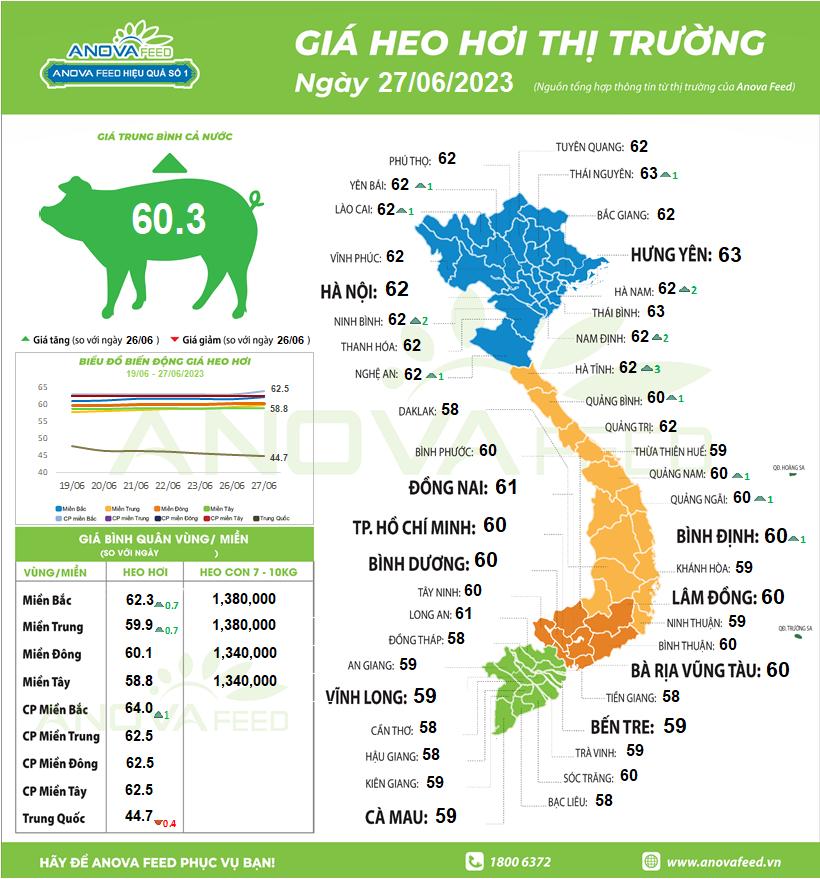 - Miền Nam giữ giá đi ngang, dự sẽ giữ được giá tốt trong thời gian dài, hiện mức giá TB toàn quốc đạt 60.300vnđ/kg.