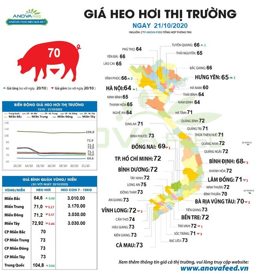 Thị trường heo hơi hôm nay ghi nhận 2 miền Bắc - Nam tăng giảm trái chiều. Cụ thể, tại miền Bắc giá heo hơi dao động trong khoảng 60.000 - 66.000 đồng/kg, tăng 1.000 - 3.000 đồng so với phiên giao dịch ngày hôm qua 20/10. Tại Thái Bình, tỉnh áp dụng nghiêm ngặt, đồng bộ các biện pháp chăn nuôi an toàn sinh học; chỉ nhập nuôi đàn heo khỏe mạnh, rõ nguồn gốc, không mang mầm bệnh dịch tả heo châu Phi.