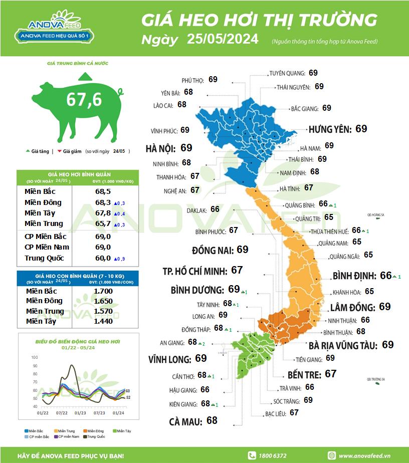 - Miền Bắc giữ giá đi ngang, các tỉnh hôm nay không có thay đổi, giá dao động trong khoảng 67.000 - 69.000 đồng/kg.
