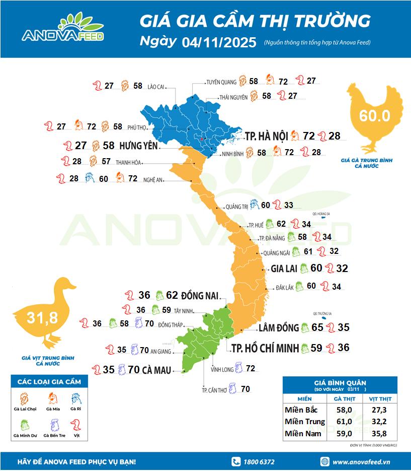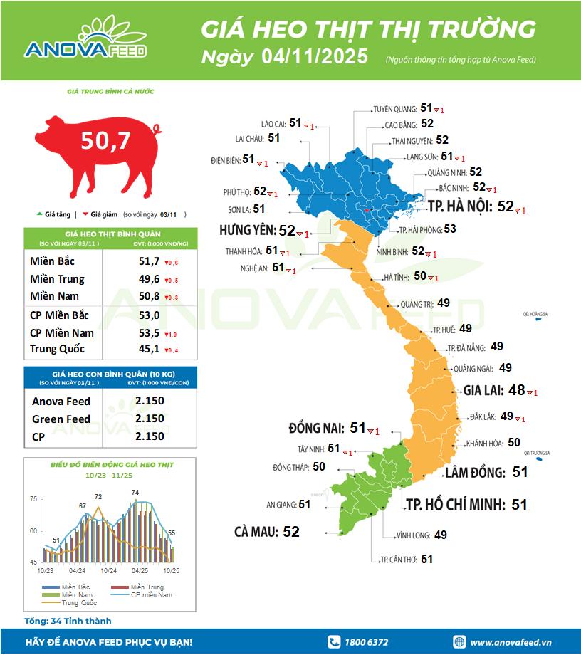 - Miền Bắc giảm tại các tỉnh: Phú Thọ, Hà Nội, Ninh Bình,... về 52.000 đồng/kg; Lào Cai, Tuyên Quang,... giảm còn 51.000 đồng/kg.