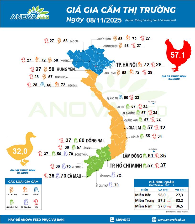 - Miền Trung tại Thanh Hóa, Nghệ An và Quảng Ngãi về giá 48.000 đồng/kg; Hà Tĩnh và Gia Lai hạ còn 47.000 đồng/kg.