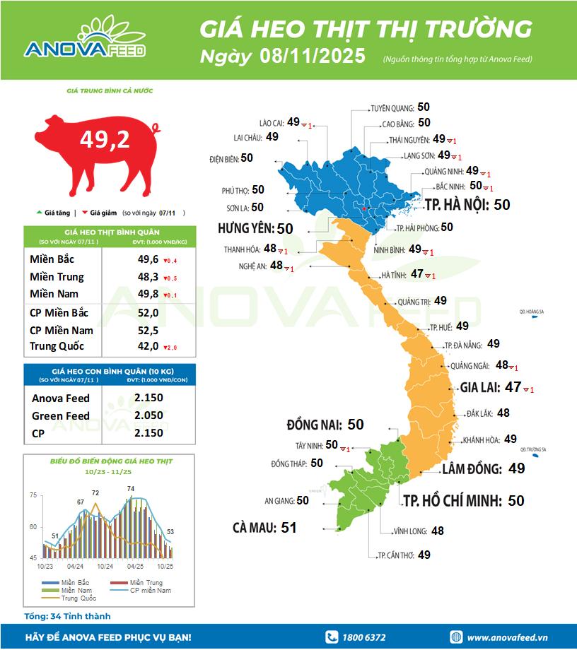 - Miền Bắc giảm liên tiếp tại Lào Cai, Thái Nguyên, Ninh Bình,... về 49.000 đồng/kg; Bắc Ninh giảm còn 50.000 đồng/kg.