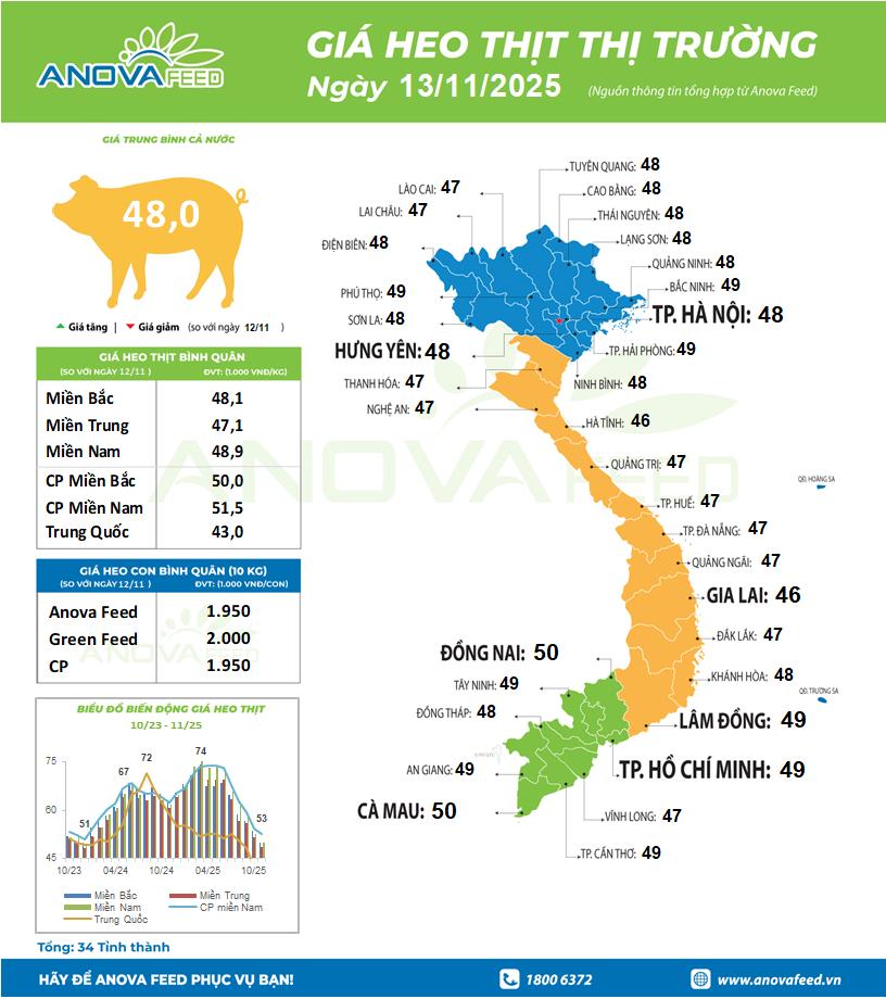 - Miền Bắc hôm nay giữ giá không đổi, các tỉnh dao động trong khoảng 47.000 - 49.000 đồng/kg.