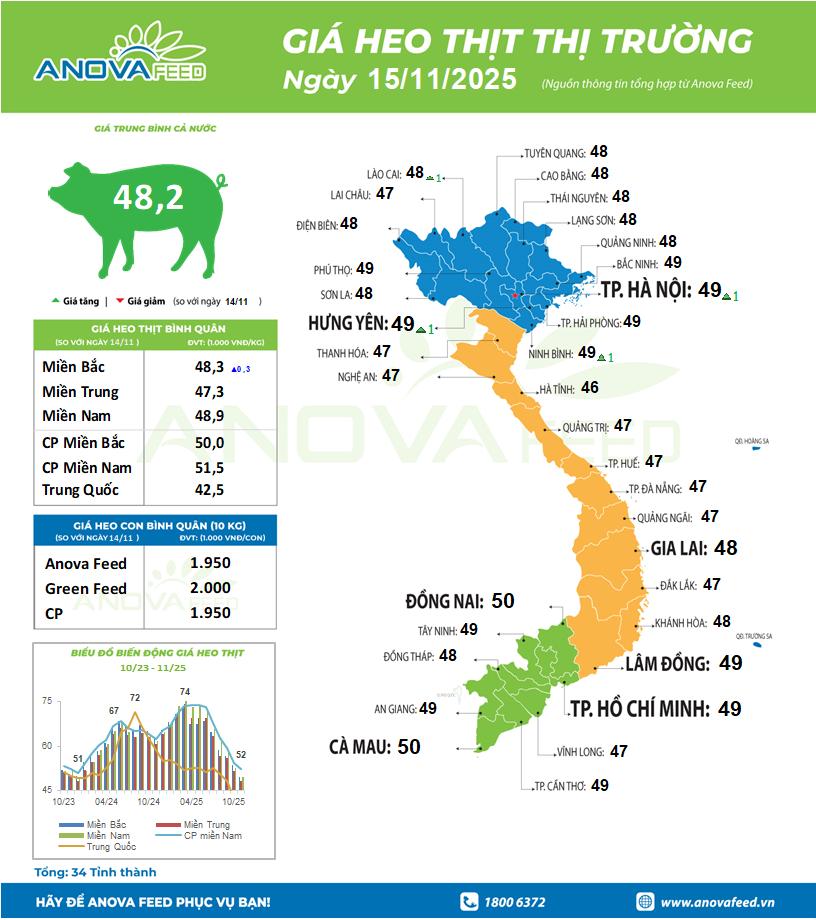- Miền Bắc nhích nhẹ 1 giá tại Hà Nội, Hưng Yên và Ninh Bình đạt 49.000 đồng/kg; Lào Cai tăng đạt 48.000 đồng/kg.
