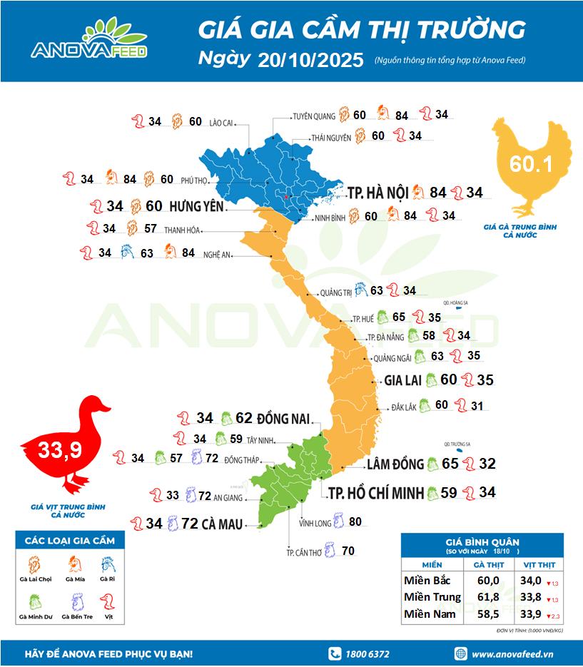 - Miền Bắc nhích nhẹ 1 giá tại: Thái Nguyên và Bắc Ninh đạt 54.000 đồng/kg; các tỉnh còn lại dao động trong khoảng 52.000 - 54.000 đồng/kg.
