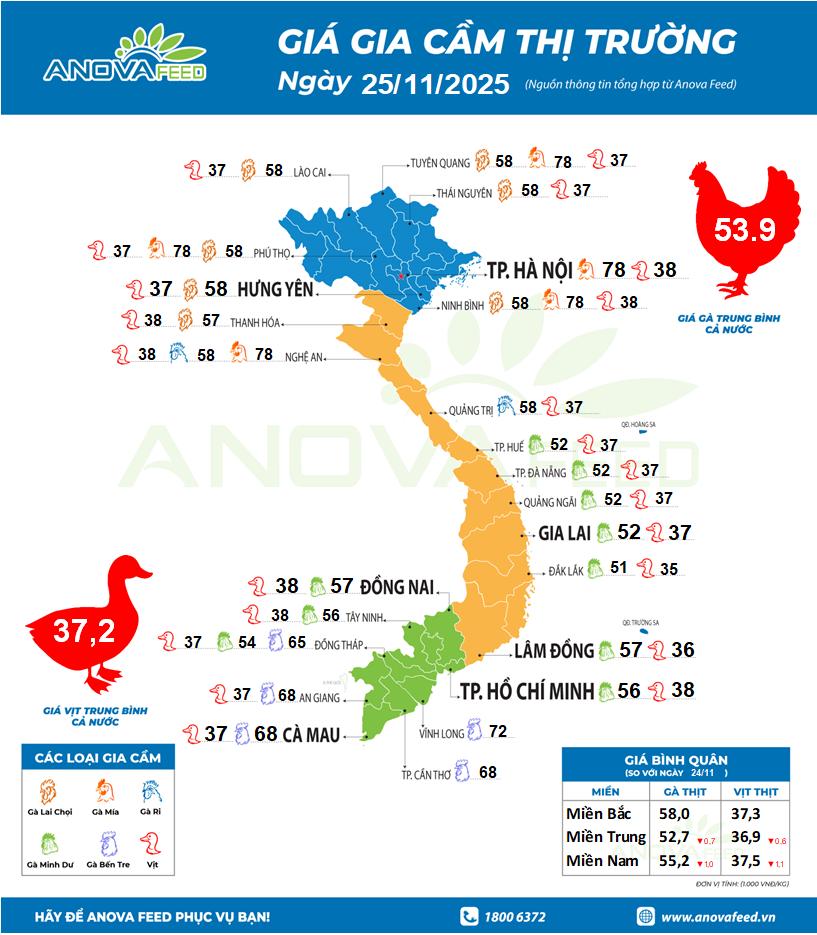 - Miền Bắc hôm nay bất ngờ giảm nhẹ 1 giá tại Phú Thọ và Hà Nội về giá 53.000 đồng/kg; các tỉnh còn lại đi ngang quanh mức 53.200 đồng/kg.
