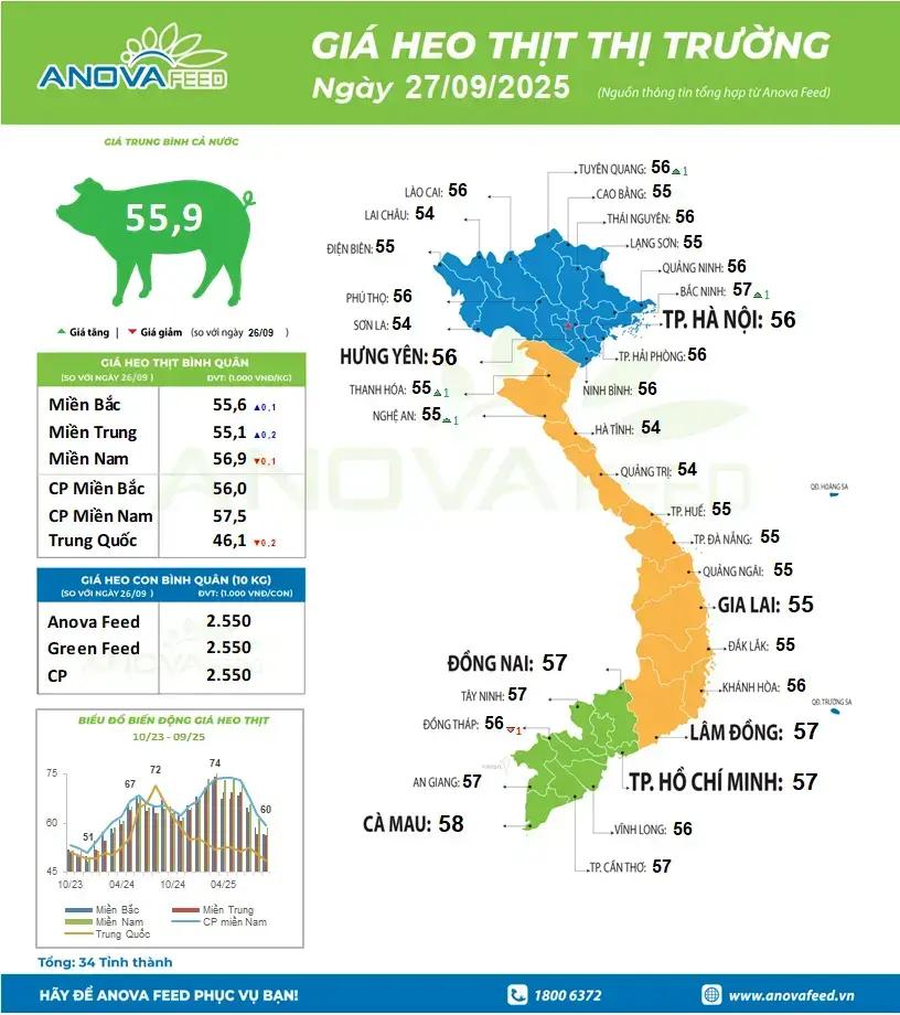 - Miền Trung cùng chiều tăng 1 giá tại Thanh Hóa và Nghệ An - đạt 55.000 đồng/kg; trung bình vùng đạt 55.100 đồng/kg.