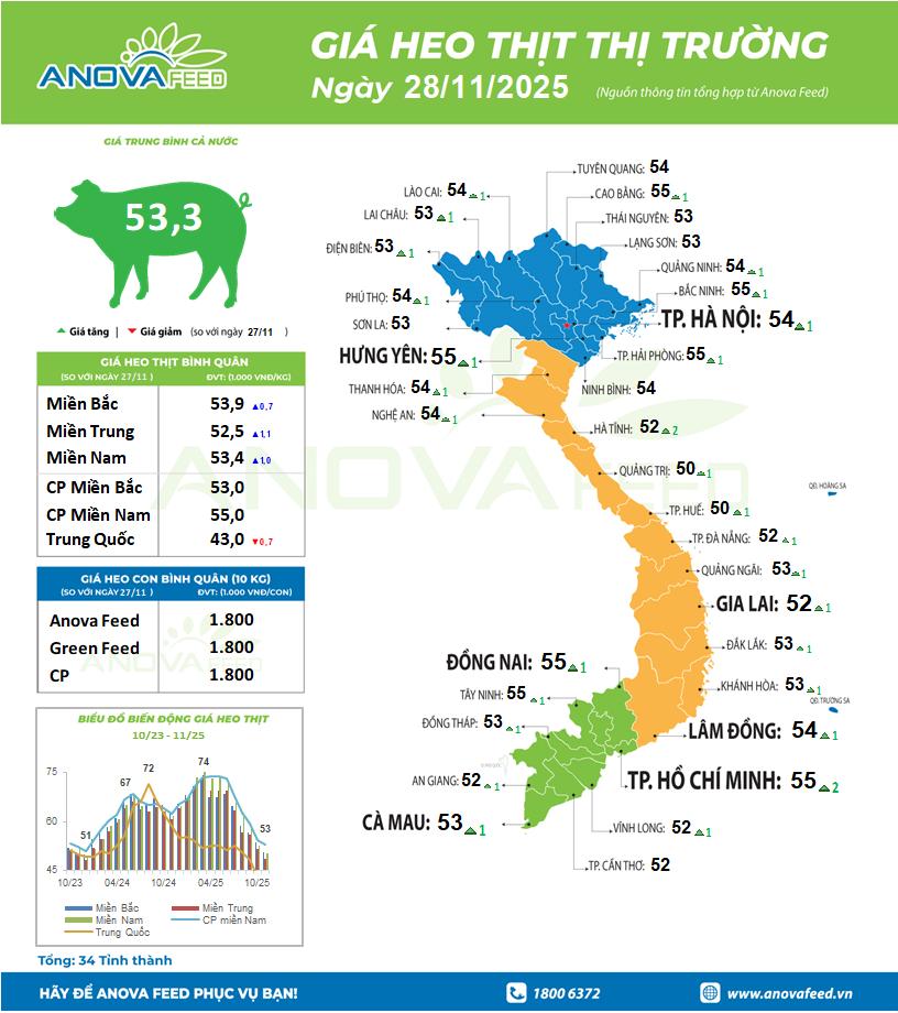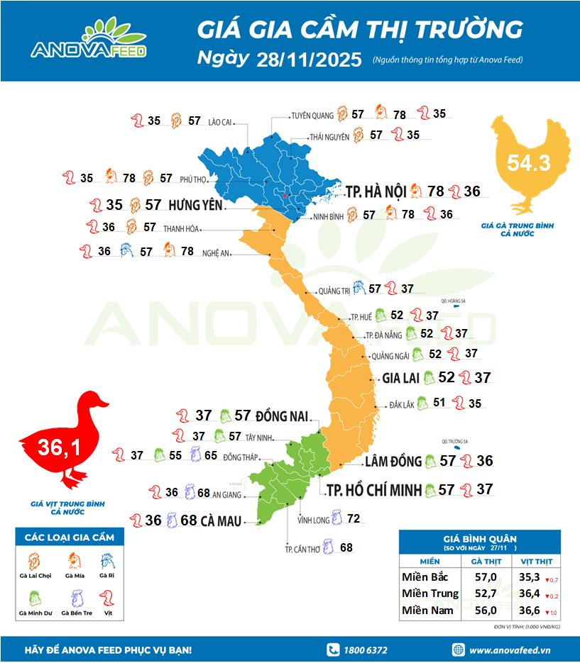 - Miền Bắc chạm giá 55.000 đồng/kg tại Bắc Ninh, Hưng Yên và Hải Dương; Lào Cai, Phú Thọ, Hà Nội,... đạt giá 54.000 đồng/kg.