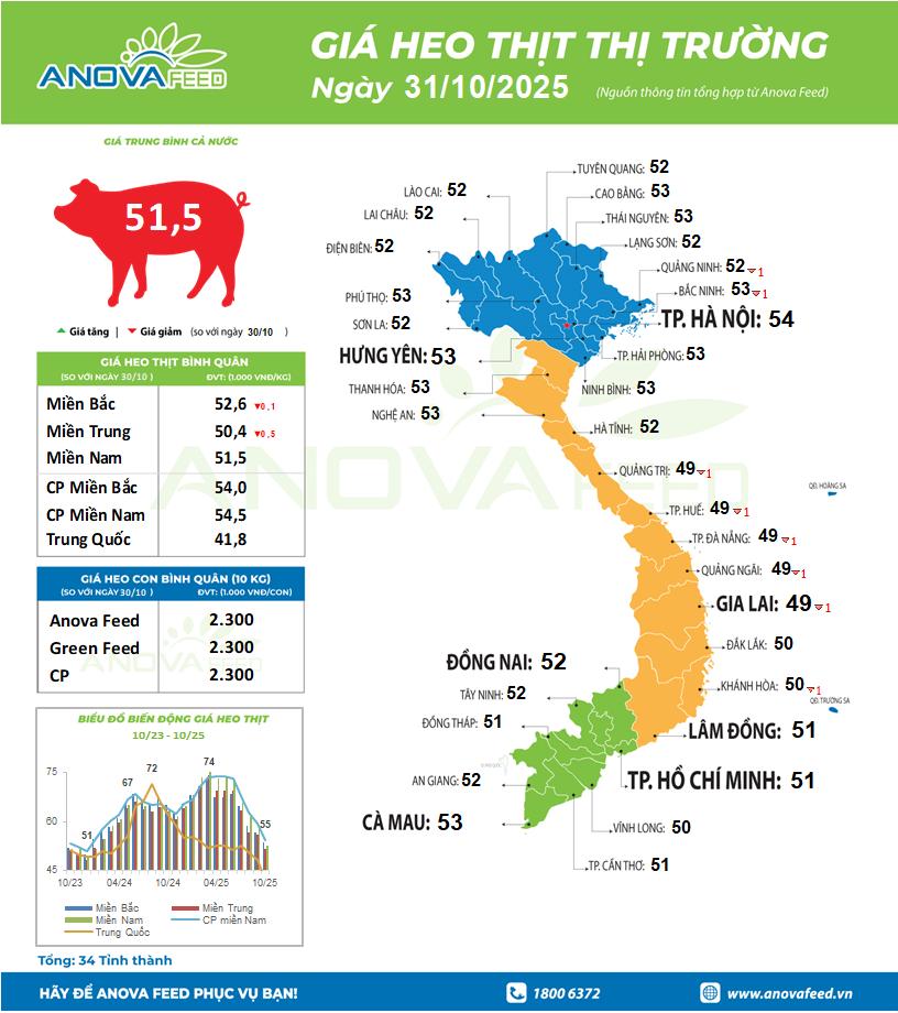 - Miền Bắc giảm thêm 1 giá tại: Bắc Ninh về 53.000 đồng/kg; Quảng Ninh giảm về giá 52.000 đồng/kg.